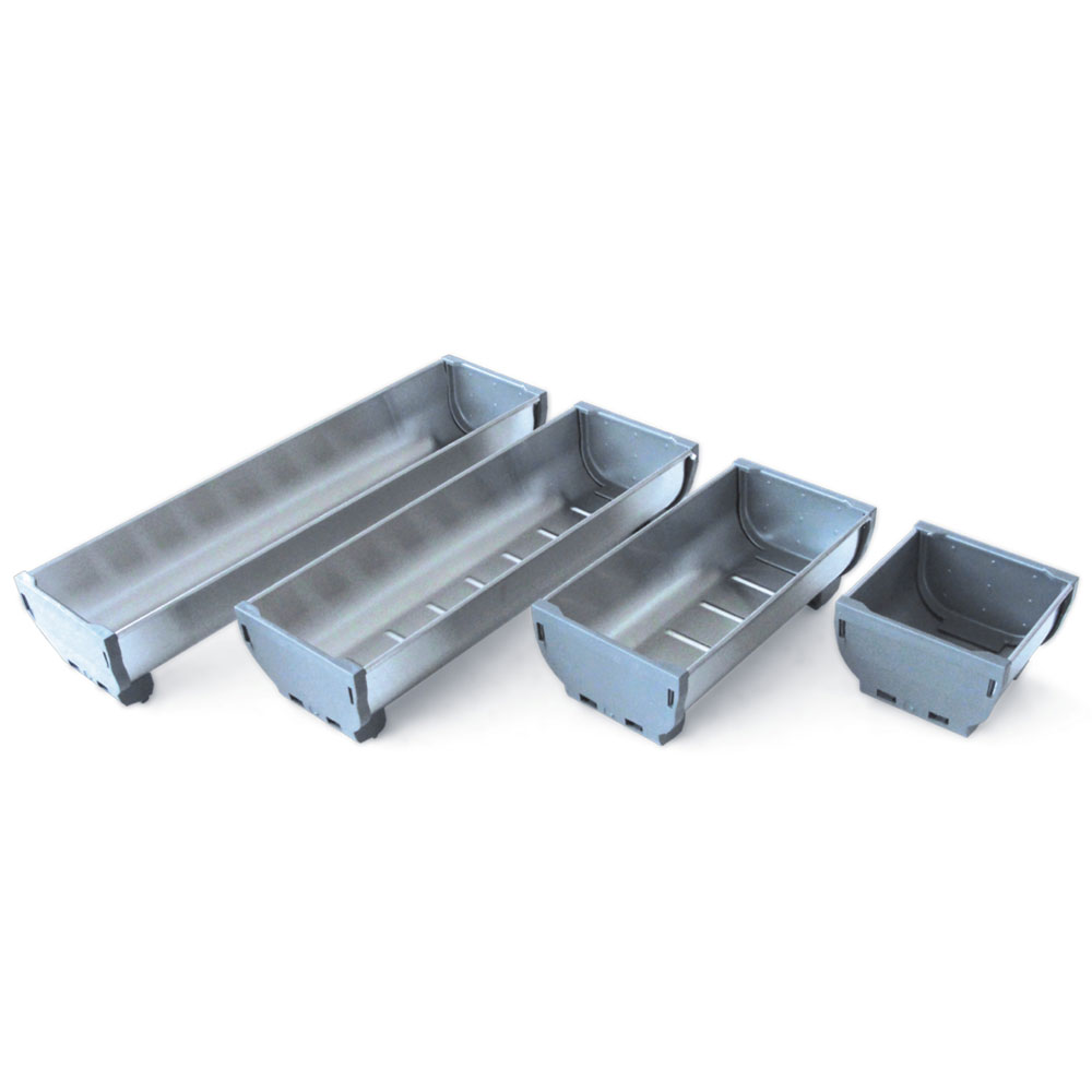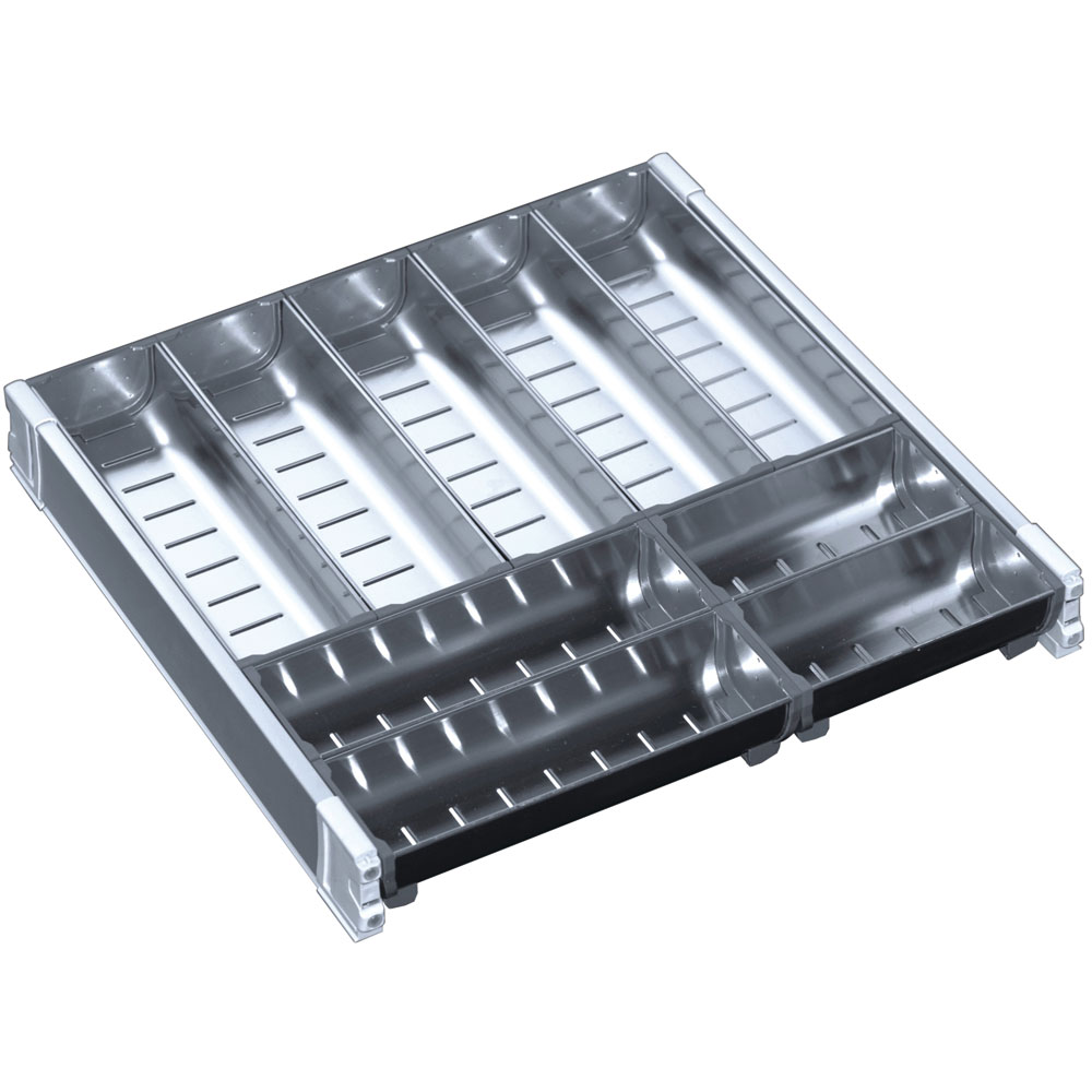 Eksklusiv bestikindsats med løse indsatser i rustfrit stål. Bestikskuffen opbygges med to skillevægge, som du fastgør med teleskopfjeder foran og bagpå din skuffe. Derefter placerer du de løse, rustfri indsatser mellem skillevæggene, helt efter hvordan du vil udforme din opbevaring. Indsatserne er derefter aftagelige for nem rengøring. Disse bestikskuffer i rustfrit stål passer perfekt i køkkenskuffer, i badeværelsesskuffen eller i garagen til opbevaring af værktøj.
