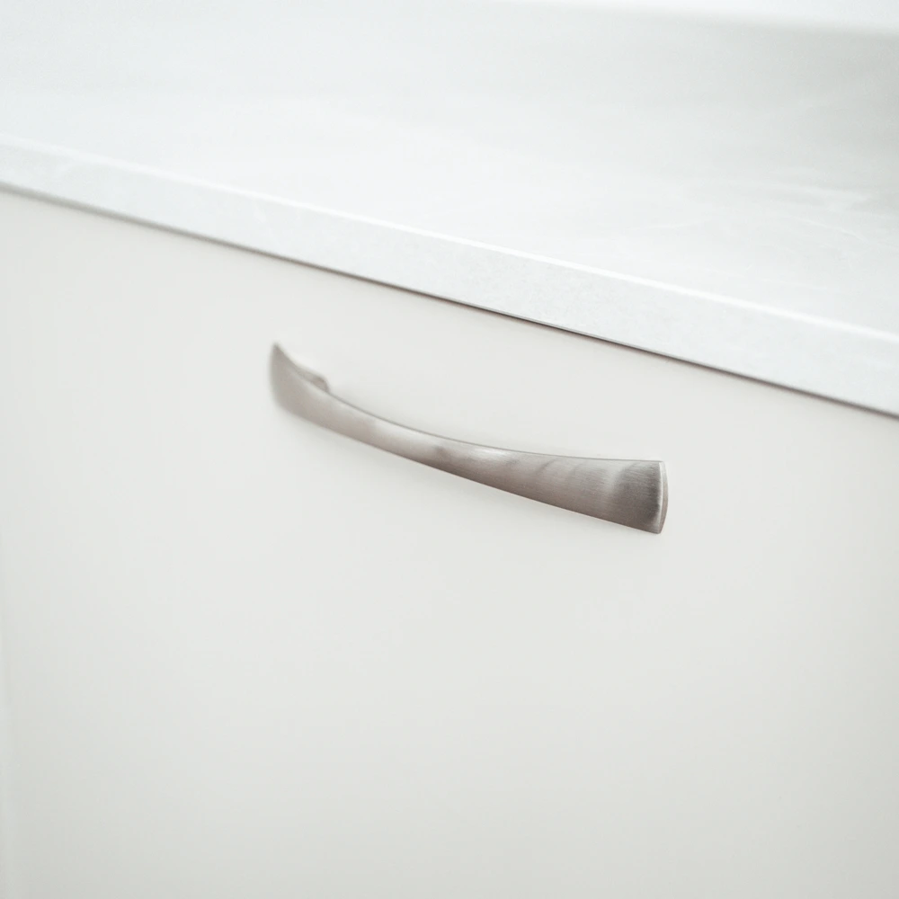Slankt og smukt greb i mat nikkel, der ligner rustfrit stål. Grebet har en buet form og flade, brede fødder. Dette er et greb, der kan pryde en kommode lige så godt, som det passer ind i et køkken med detaljer i rustfrit stål.