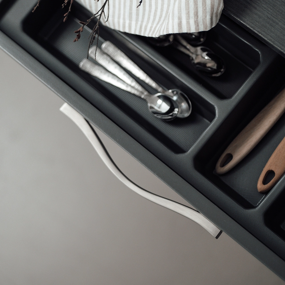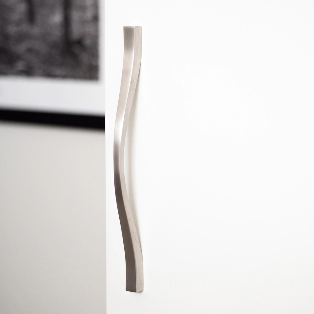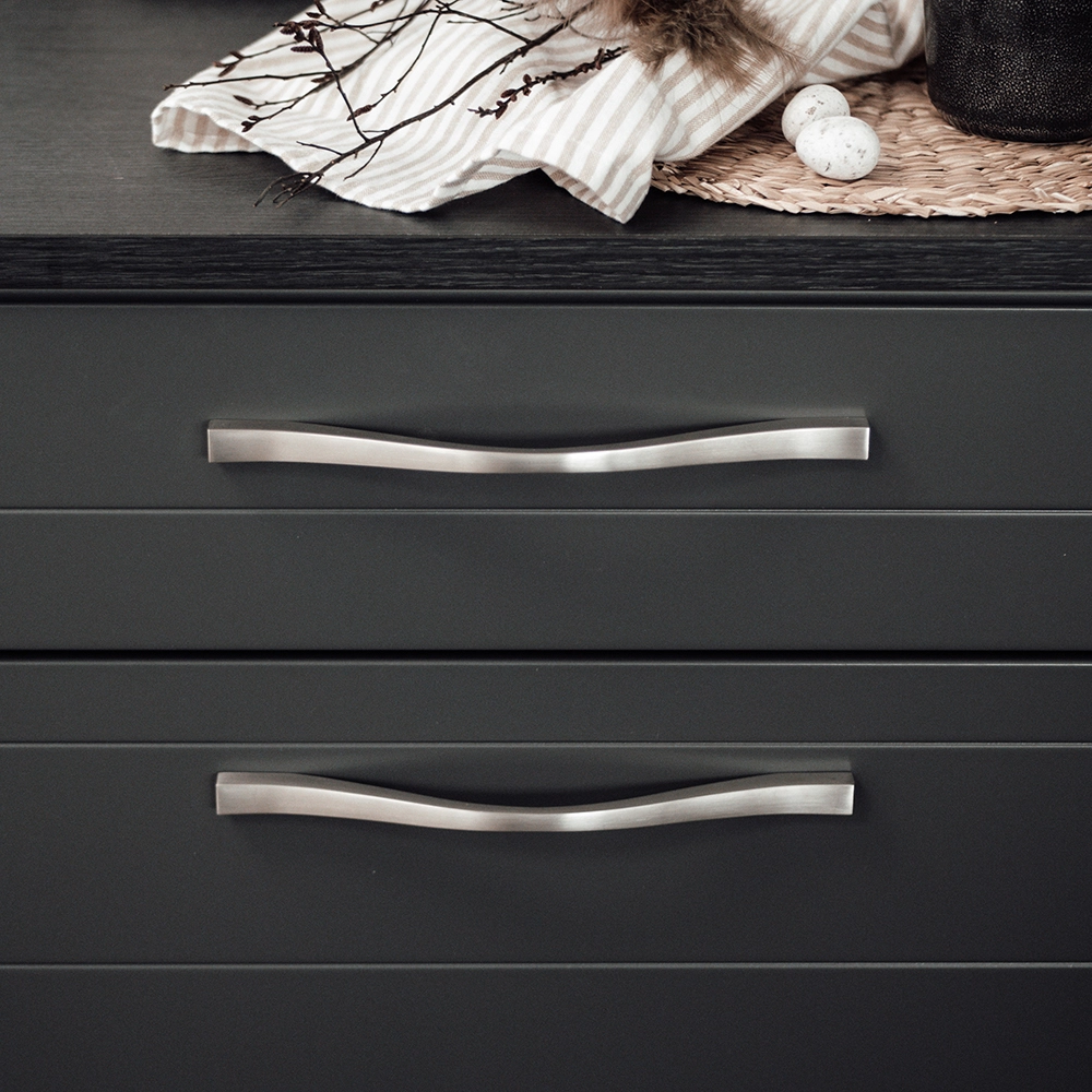 Flow køkkenhåndtag er et minimalistisk smalt beslag, der bliver en stilren detalje på køkkenskabe, kommodeskuffer eller garderobedøre. Flow har et blødt design, der følger formen af en bølge mod dørene, og Flow er desuden udstyret med to cc-mål i ét beslag, så de passer til flere forskellige køkkener. Flow i børstet nikkel bliver en moderne klassiker og passer lige så godt alene i køkkenet eller i kombination med knoppen Dot i samme udførelse.