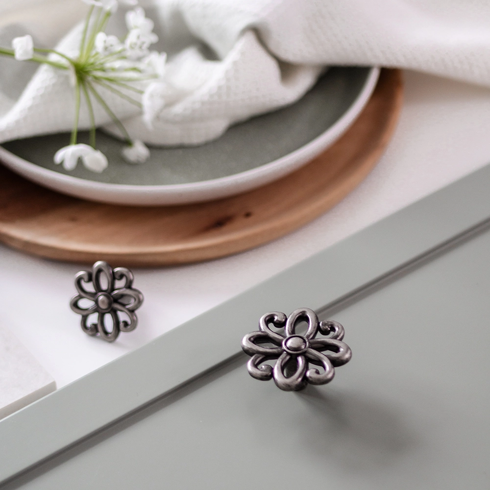 Giv dine møbler et stilfuldt og orientalsk touch med knoppen Marrakech. Med sit smukke blomstermotiv og detaljerede design minder denne knop om de rige mønstre og traditioner fra marokkansk og orientalsk indretning. Den sorte oxidfinish giver et rustikt udtryk, der passer perfekt til at skabe en varm og indbydende atmosfære. Marrakech er et fremragende valg til kommoder, skabe og døre, der har brug for et strejf af elegance og kultur. Det detaljerede design og den holdbare konstruktion gør den både smuk og funktionel.