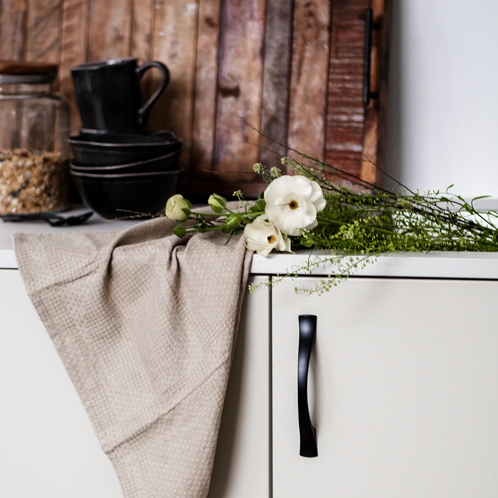 Moderne køkkengreb med brede fødder og et blødt bueformet design. grebet har en klassisk stil, der passer godt til moderne skandinaviske køkkener.