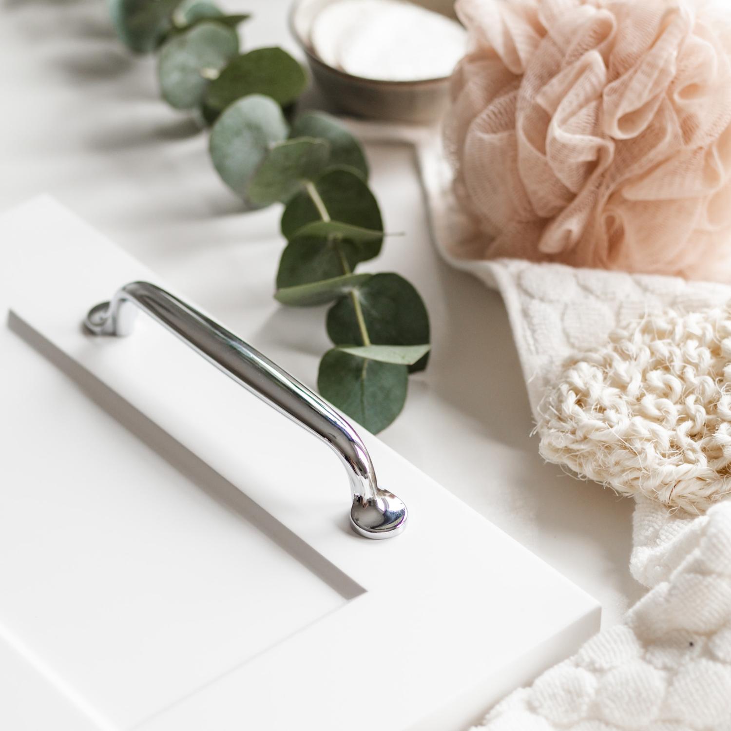 Et pænt greb i blank krom med stilrent design og runde fødder. Grebet er blødt formet med en noget bredere midte.