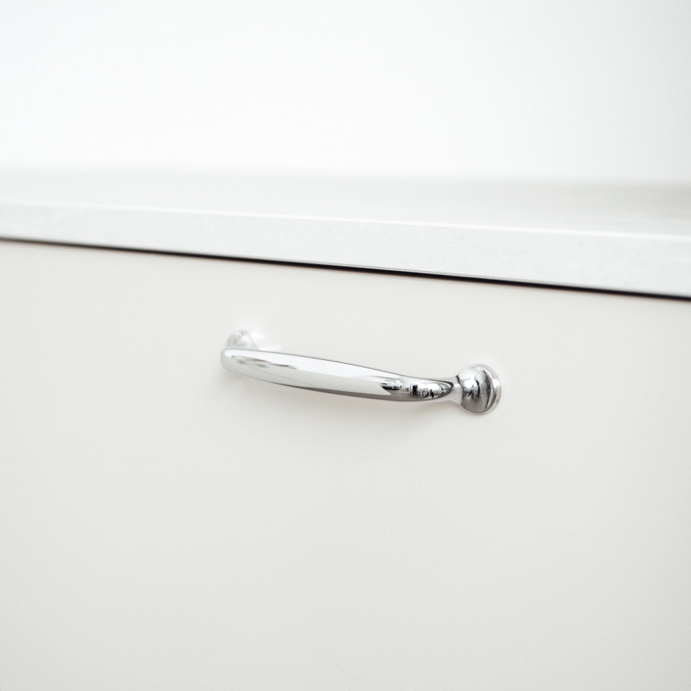 Et stilfuldt greb i blank krom med et enkelt design og runde fødder. Grebet er blødt formet med en lidt bredere midte.