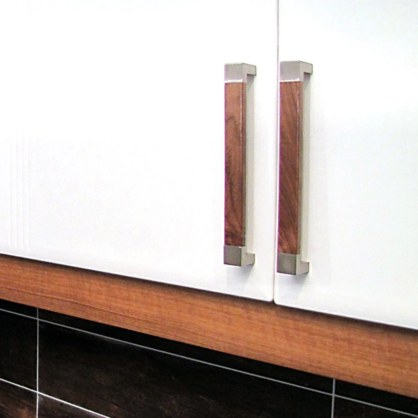 Håndtag med fødder i rustfrit look og greb i valnød. Valnød er en moderne træsort, der passer til mange stilarter og køkkentyper samt til andre møbler.