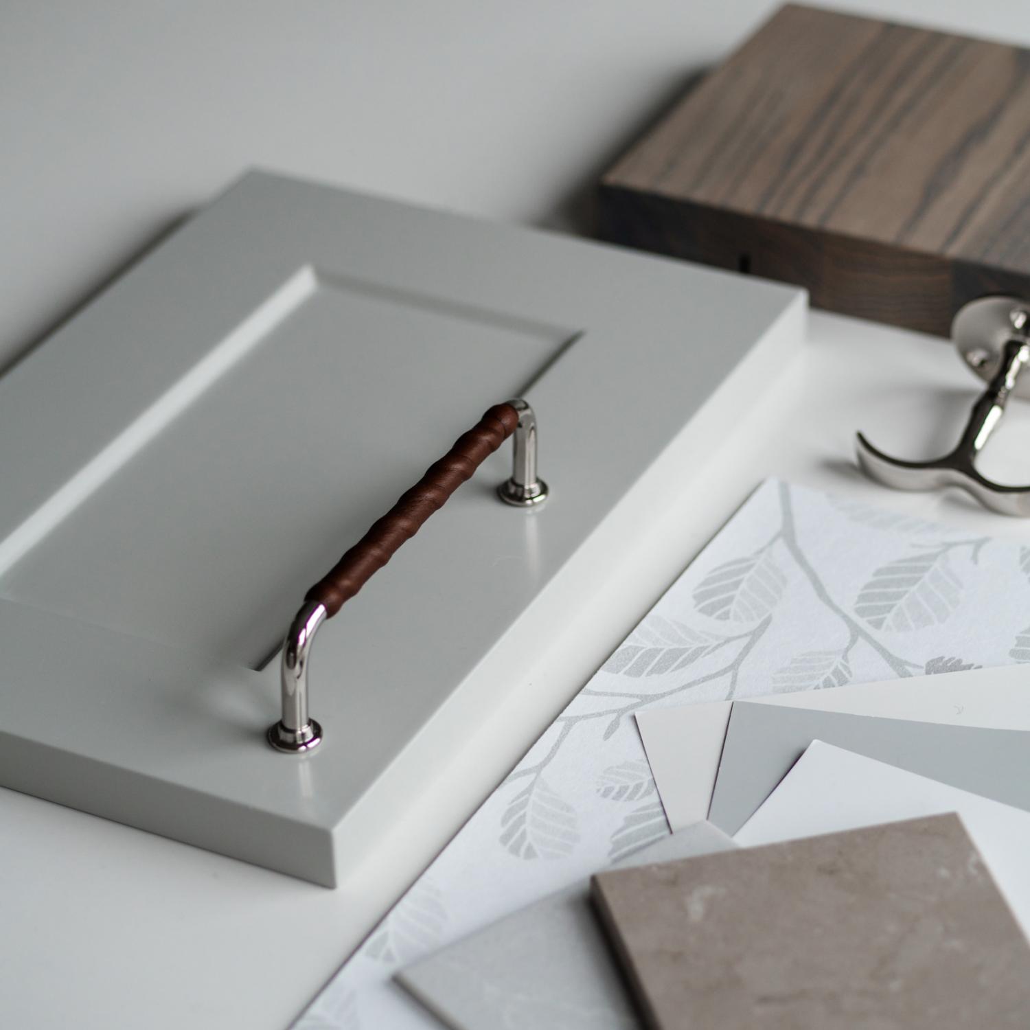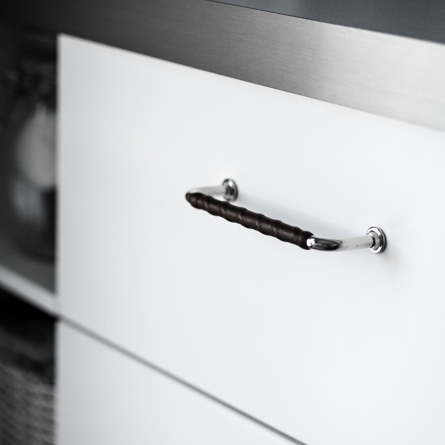 Fine nikkelgreb med brunt håndviklet svensk læder. Passer både til køkkenet, garderoben eller en kommode. Læderet stammer fra svenske Tärnsjö Garveri, og grebet er produceret i Sverige. Læderviklede køkkengreb er det nyeste inden for beslag, og her finder du dem til markedets bedste pris!