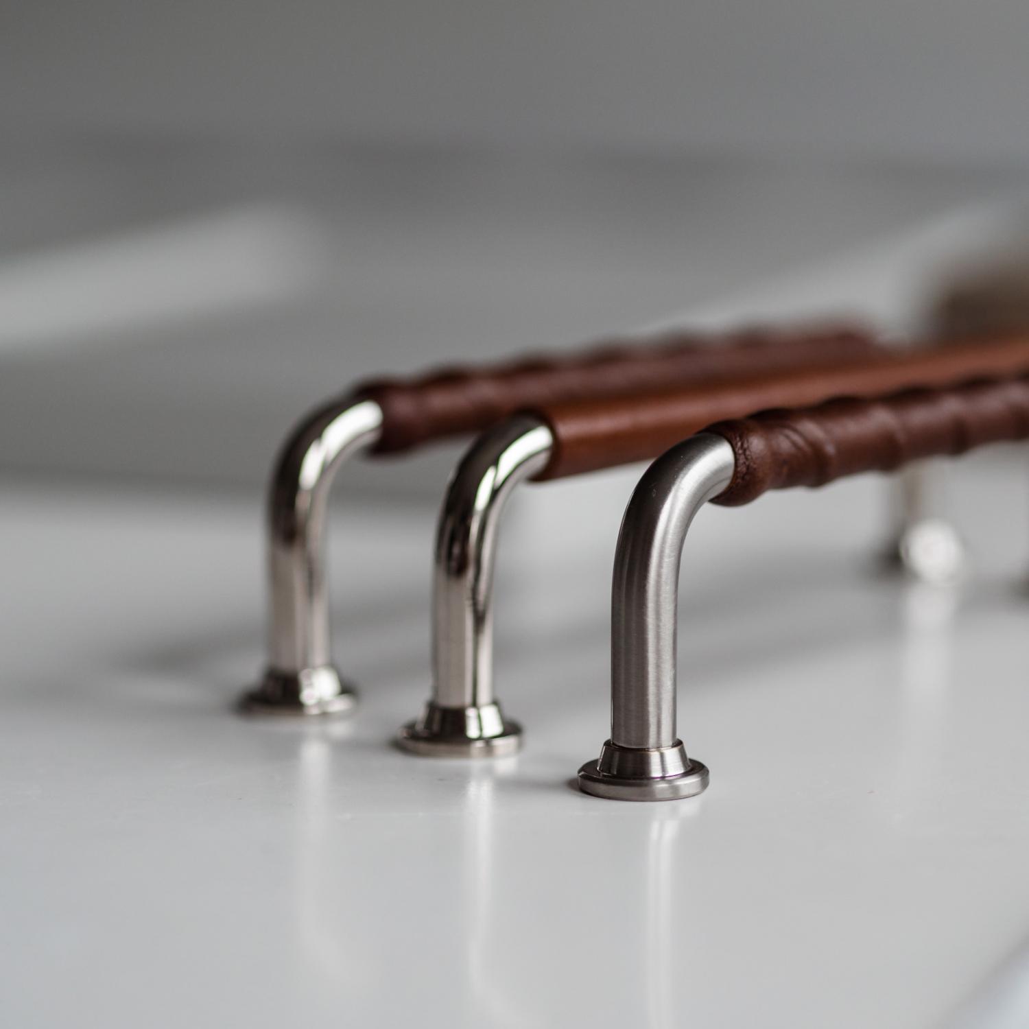 1353 er et stilrent minimalistisk greb i blank nikkel, her med brunt læderviklet læder. Vælg mellem to forskellige cc-mål.