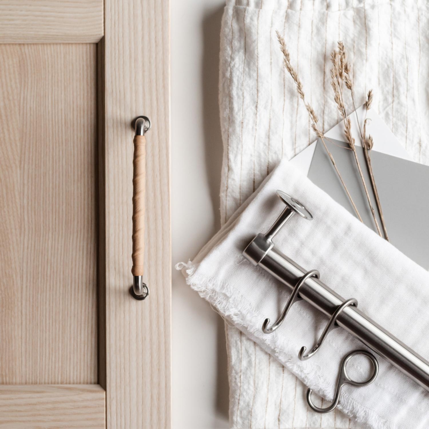 Elegante greb i rustfrit look med håndviklet svensk læder. Passer både i køkkenet og på et garderobeskab eller en kommode. Læderet stammer fra køer og kommer fra det svenske Tärnsjö Garveri, og grebet er fremstillet i Sverige. Læderviklede køkkengreb er det nyeste inden for beslag, og her finder du dem til markedets bedste pris!