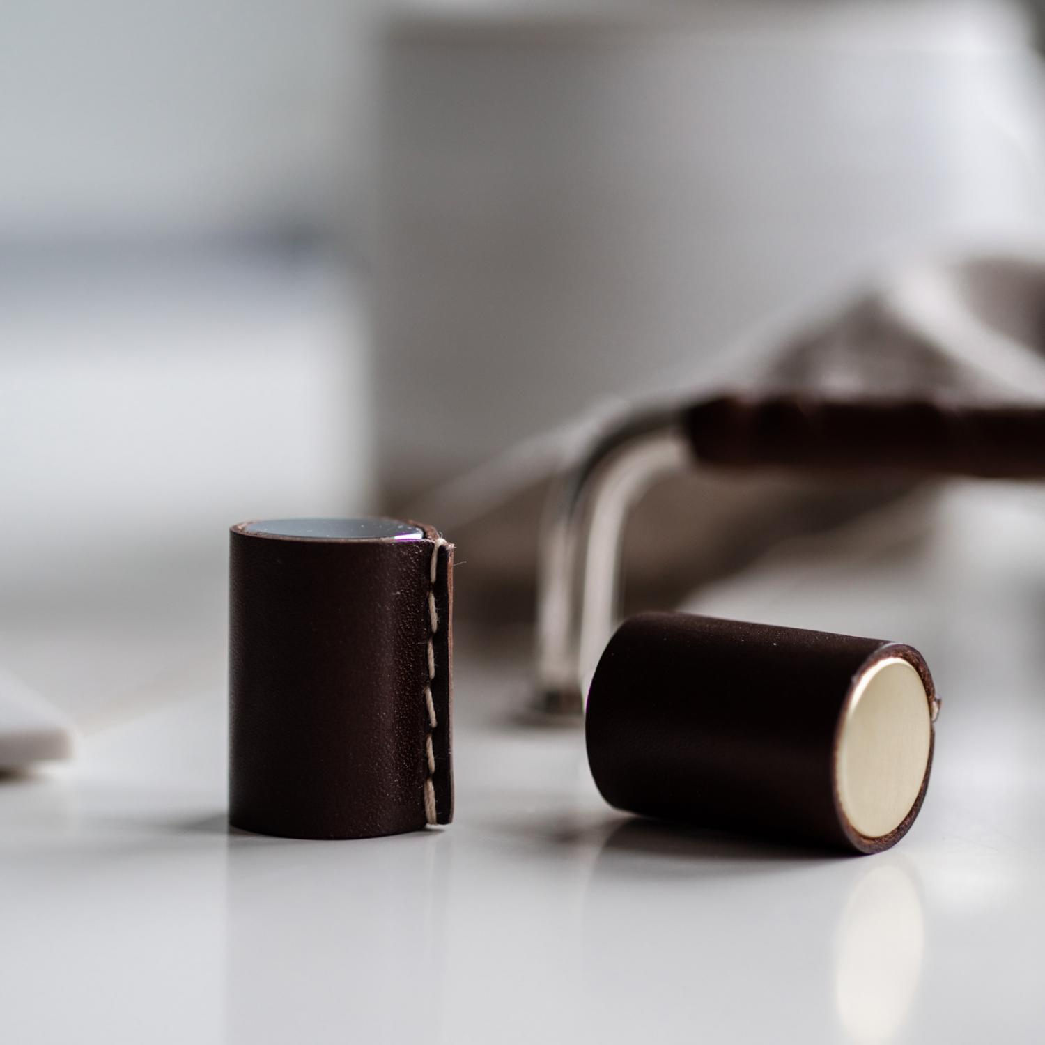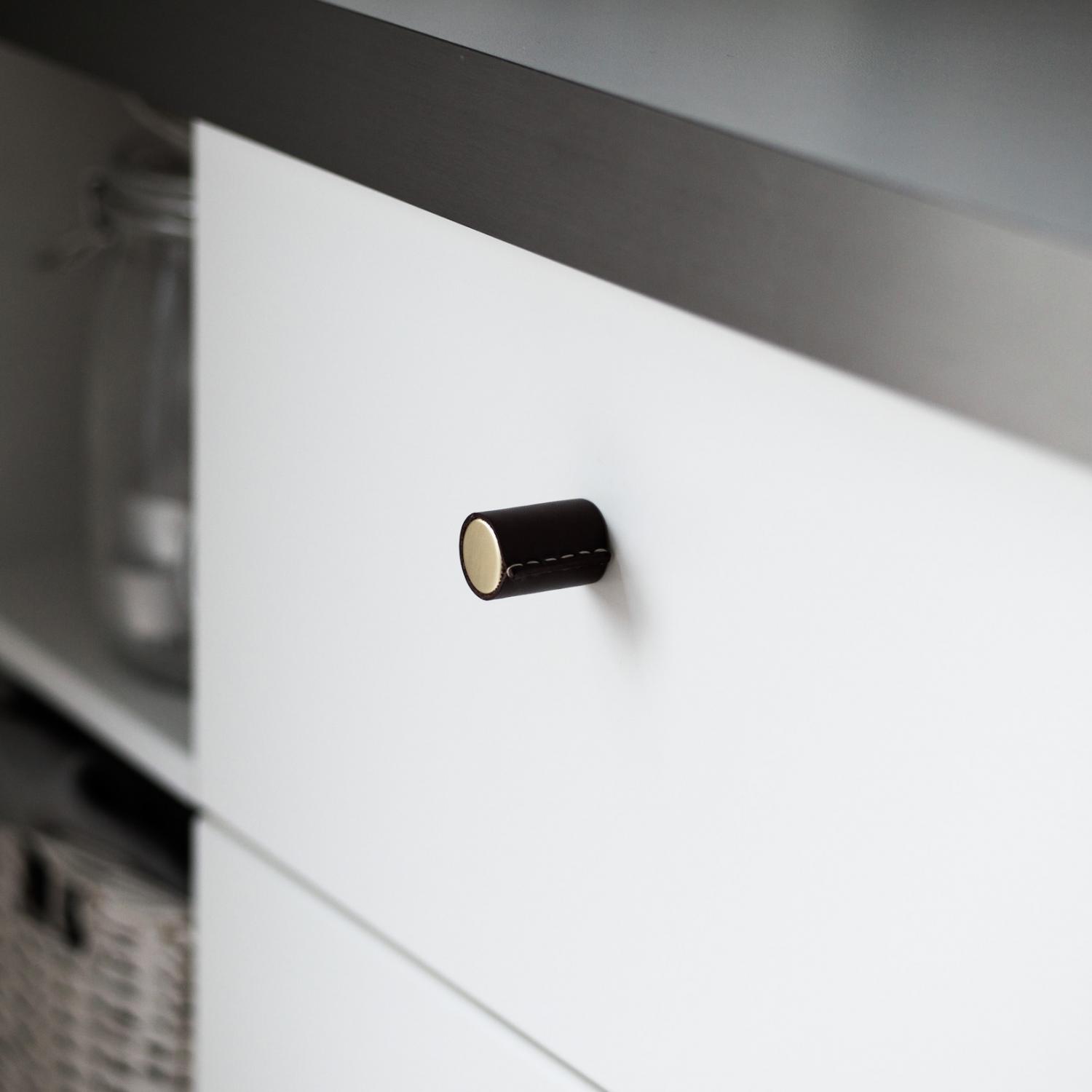 Metalknop med eksklusiv læderbelægning og syning, giver et unikt præg til kommoder, garderobeskabe eller køkkener.