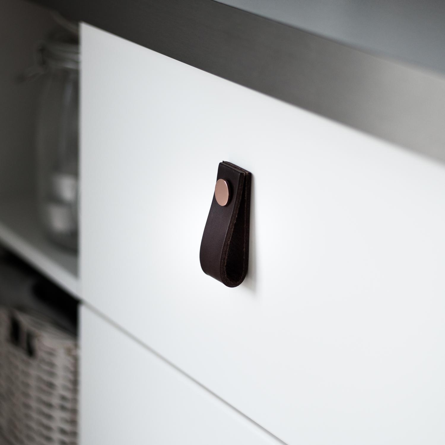 Lædersnor til kommode og køkken i svensk læder. Brunt læder og kobberfarvet detalje.