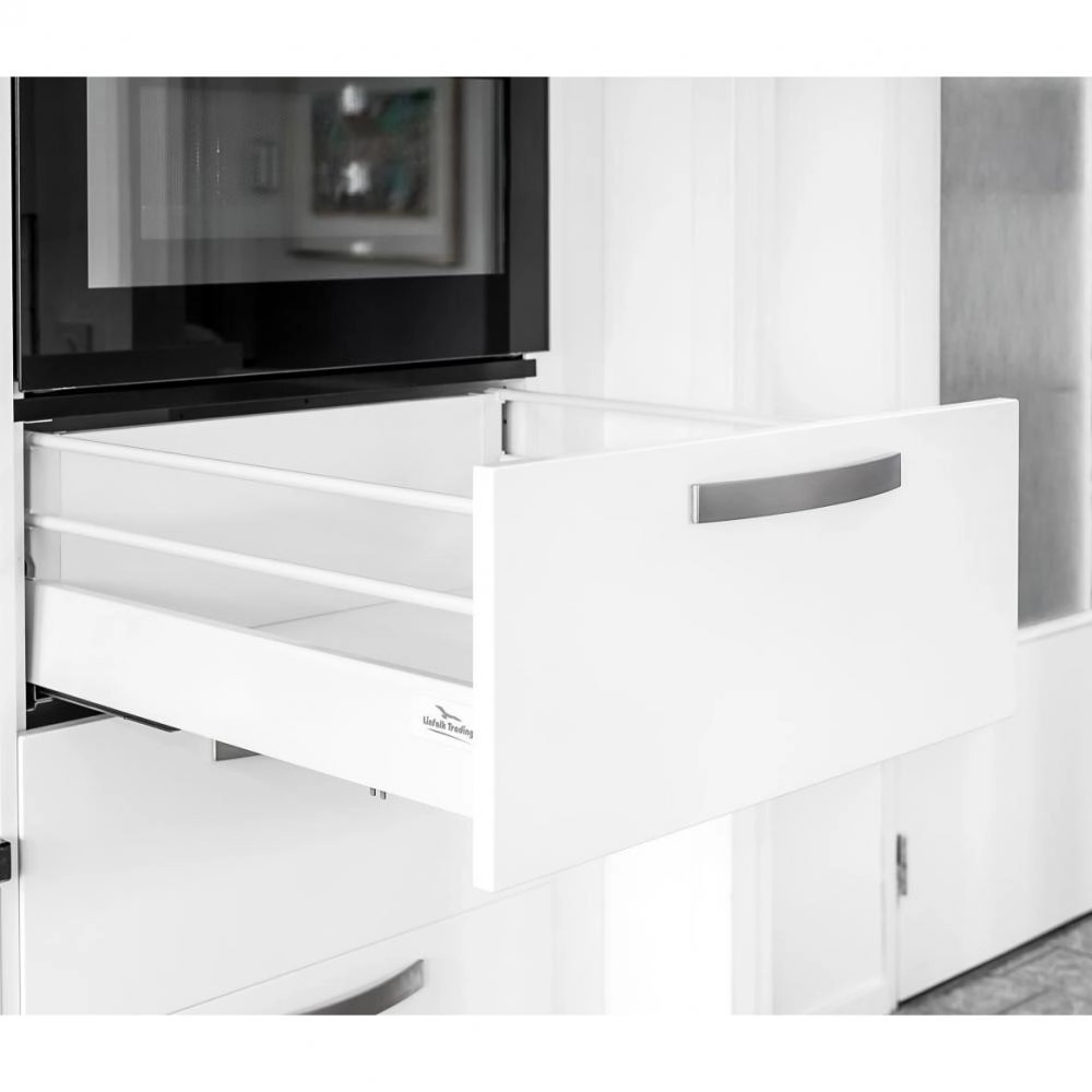 - Skuffen leveres komplet med skinner med dæmpning og fuldt udtræk.