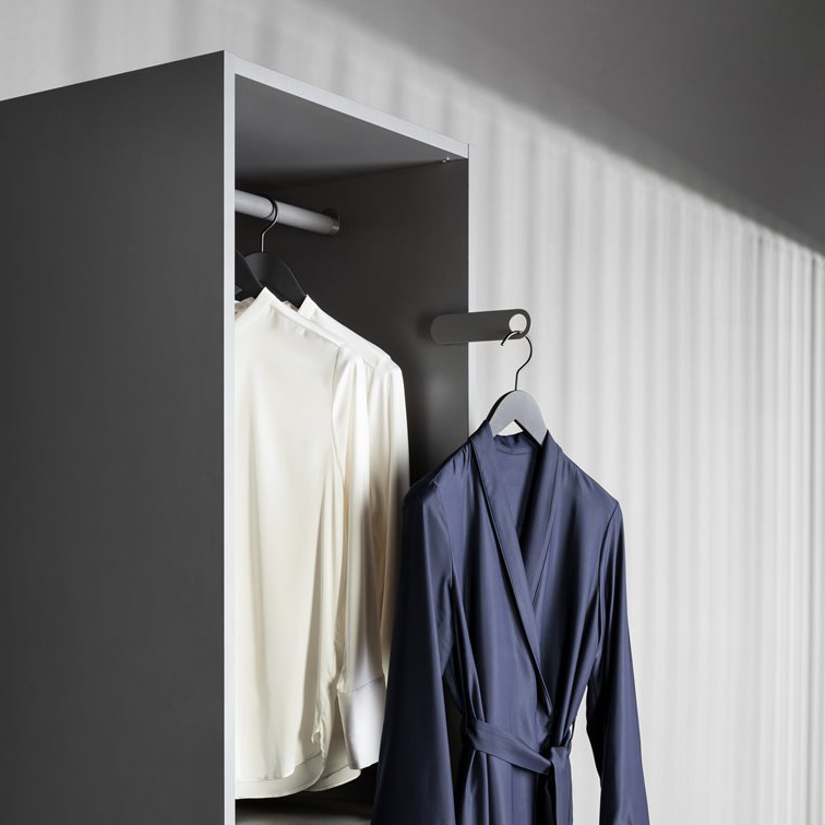 Praktisk krog, der kan foldes ud og ind i skabet efter behov. Perfekt til at holde skjorten pæn efter strygning i vaskerummet og for at have dagens outfit let tilgængeligt ved garderoben.