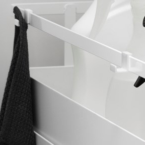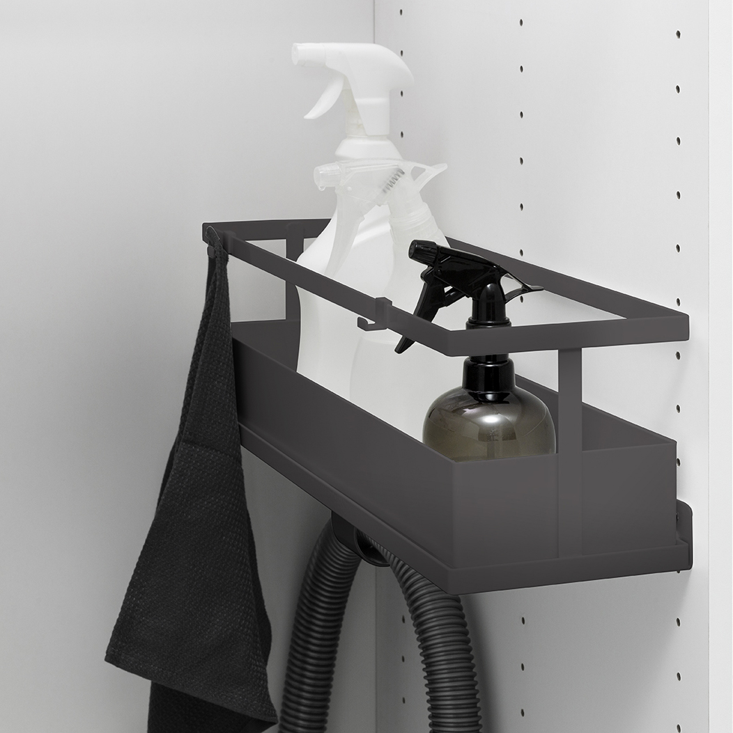 Opbevaringsboks til rengøringsskabet med kroge og slangeholder. Smart løsning og nem montering til opbevaring af rengøringsmidler, klude og støvsugerslangen. Uddrageren er sidemonteret med vendbart beslag til montering på den venstre eller højre side i skabet, og holderen til rengøringsmidler er aftagelig for nem rengøring.