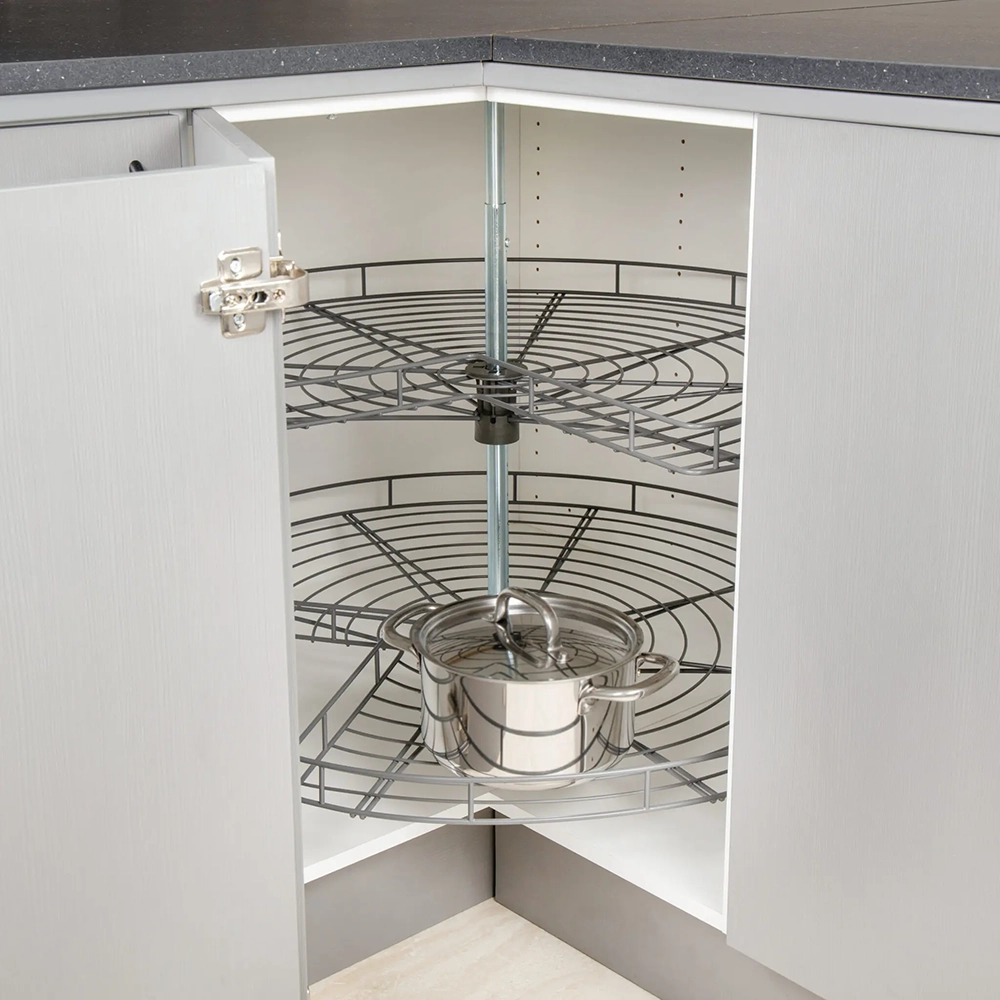 Praktisk 3/4 karussel med to kurve. Passer klassiske hjørneskabe og monteres i bunden og i loftet af skabet.