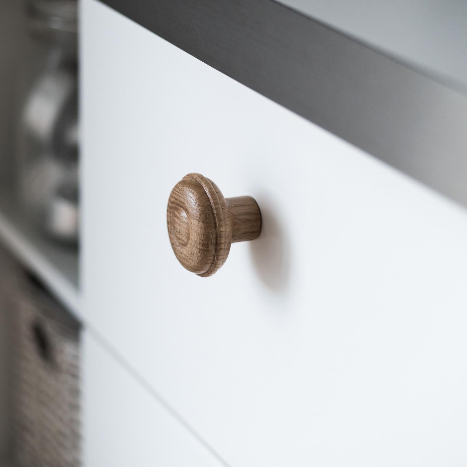 Denne knoppen har et unikt design og er lavet af egetræ. Passer både i køkkenet, i gangen og på badeværelset!